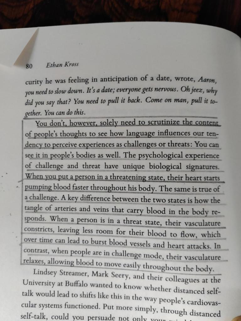 The closing chapter (pre the tips) has a discussion around one of Kross’ students asking the question – “Why weren’t we taught this sooner?” and it does make me wonder why so much of today’s neuroscience / well being / nutritional advice is lacking from teaching and education in general. Whilst you could suggest that some of the advice given above is common sense, having it backed up elsewhere makes it even more persuasive and really does pose the question – why don’t we teach this stuff more explicitly to children? For me, above definitely fits into my category of creating a healthy and productive individual, however I don’t hold out hope for such work to become part of mainstream education any time soon. In light of that, I hope I can use what I have learnt for good – and the book itself becomes far more widespread.