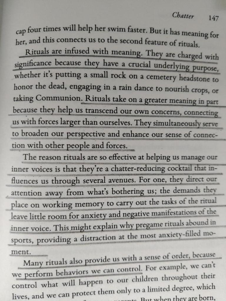 Chatter is all about our internal voice, how it impacts us and what we can do to influence this internal chatter. It’s really well written, with Ethan Kross using his own experiences coupled with his research and that of others to support his suggested strategies. He finishes the book with 10 pages of tips, which in isolation would be great to know – however are even more powerful when contextualised throughout the previous 160 pages. One tip I tried recently, which I loved, is using your own name when engaged in your own chatter. This allows distance as opposed to immersion – and the subsequent ability to be more reasoned and almost productive in how you think/ponder on a problem. I particularly liked these 2 passages:
