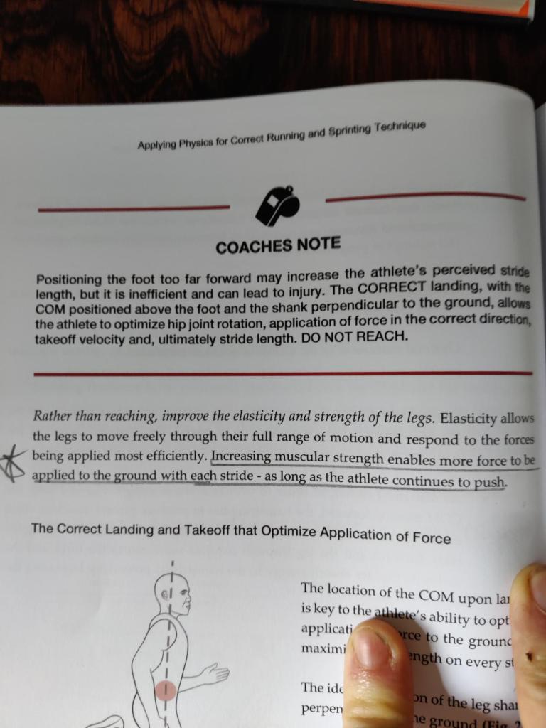 The second book – The Science of Speed and the art of the Sprint is a superb explanation of how to run fast (and in turn how to run well, full stop.) Tom Tellez is a longstanding coach, with huge experience matched by the success many of his athletes have had. The book is clear, concise and really helpful in developing my understanding around exactly how we run, from a bio-mechanical and physical perspective. He supports this with images and drills. The key idea of force into the ground and how/ where this occurs being wonderfully explained. Alongside why forcing knee drive is a mistake. I also found below striking: