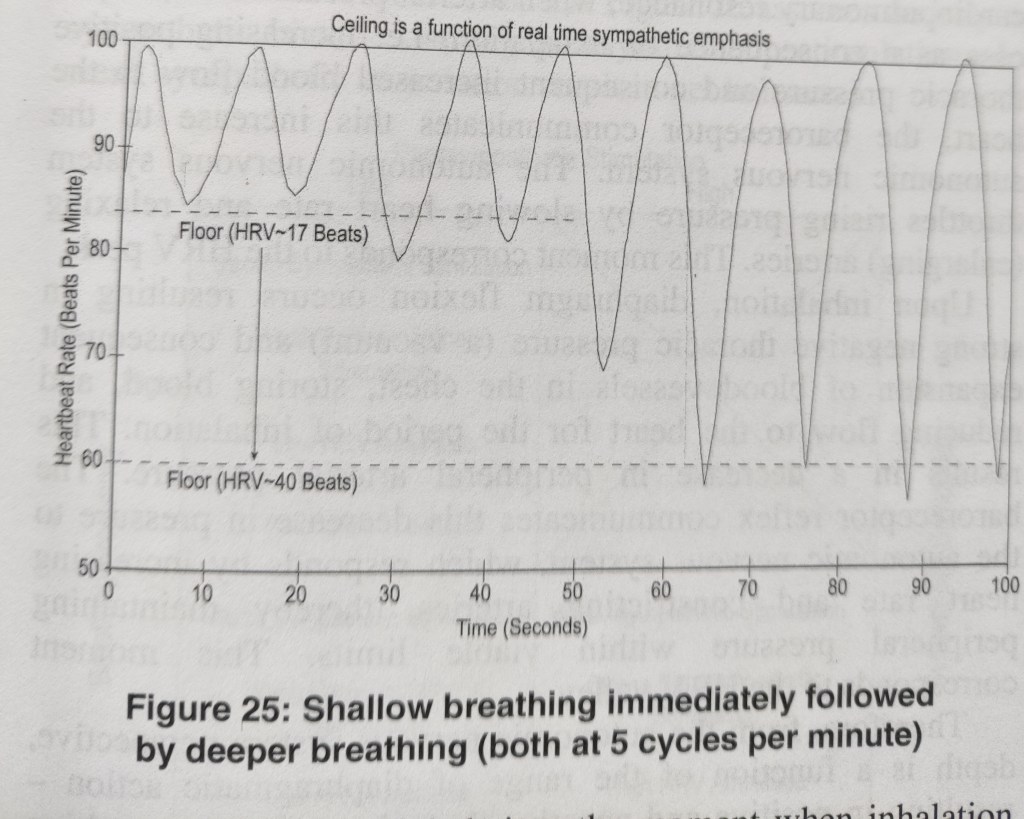 “Upon inhalation, diaphragm flexion occurs resulting in strong negative thoracic pressure (a vacuum) and consequent expansion of blood vessels in the chest, storing blood, and reducing flow to the heart for the period of inhalation. This results in a decrease in peripheral arterial pressure. The baroreceptor reflex communicates this decrease in pressure to the autonomic nervous system, which responds by increasing heart rate and constricting arteries, thereby maintaining peripheral pressure within viable limits. This moment corresponds to the HRV valley.”