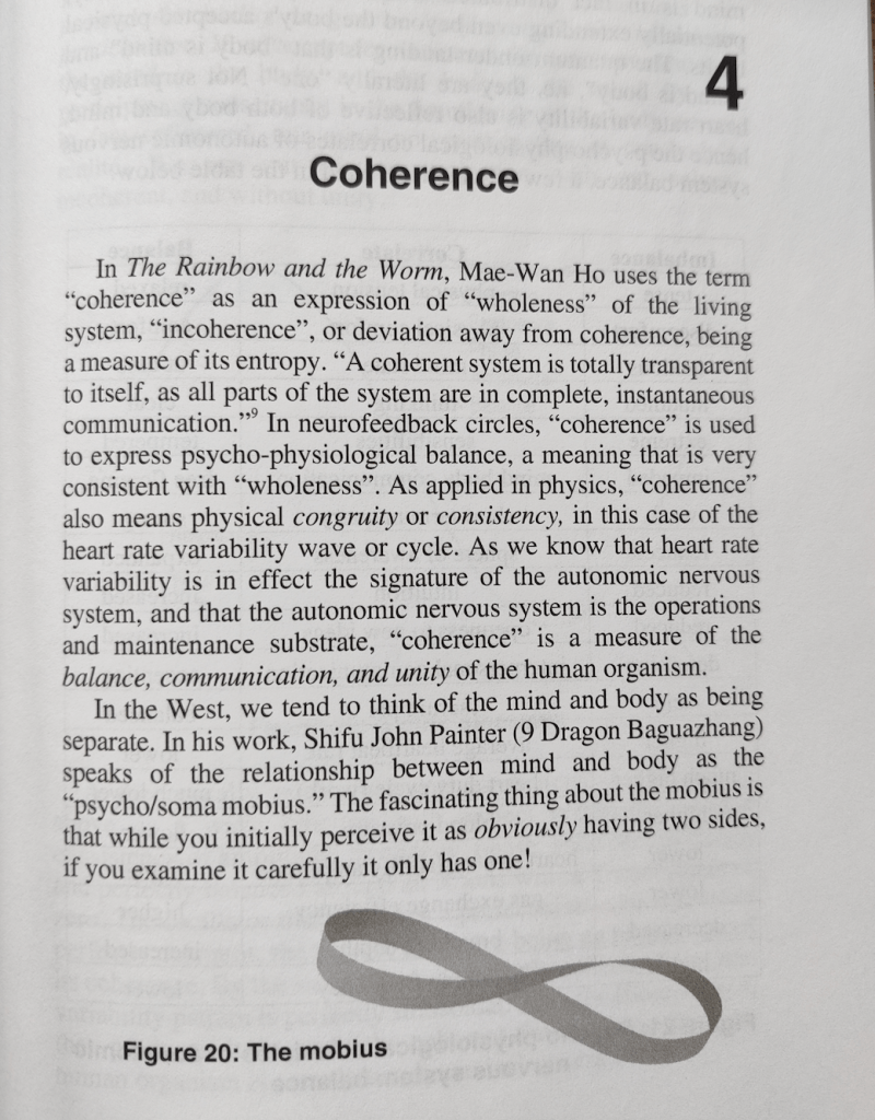 The image above is from the opening of chapter 4, which clearly outlines what the authors believe coherence to be, the balance and unity of ourselves as a whole, mentally, physically, spiritually, emotionally – rounded and functioning optimally. The use of the mobius a strong visual metaphor to illustrate this. It also chimes with exactly how I feel once I embark on coherent breathwork.