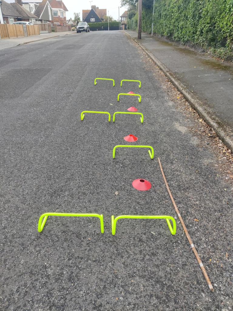 What I then did was have 2 sets of wickets ready. One of 4 wickets for hopping, all around 2m or 6ft apart. One next to these of 6 wickets, 1m or 3ft apart, with a cone where I wanted the foot to land before. I was finding that too many of the less coordinated juniors where drifting / pushing / leaping over the wickets when there were 10. So I thought break it down, reduce it and help give them a feeling of success, so part 1 of this was next. A tip here is having a measuring stick (bamboo with masking tape on it for me) to quickly measure the distances for each wicket. It also helps having the same coloured cones – different to the wickets themselves – to support what the juniors are looking for: