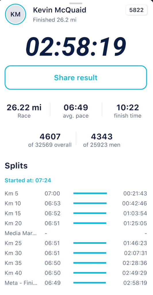 I’ve never paced a marathon well – this was my 7th. Too often I go off too fast – this being the case for the last 2, London & Boston – which was in itself some sort of madness as I’d had injuries that totally disrupted my training pre running the races. So the one big, big thing I had in my head for Valencia was to run a negative split – this my A goal, over and above anything else. Which in turn meant I had to dial in my pacing, and I managed to do just that (which the image above pays testimony to) in a way that not even I had envisaged. Unsurprisingly it made the whole race feel so much better.