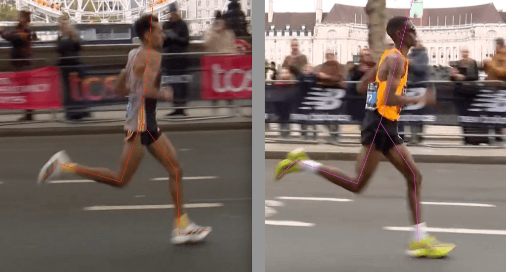 This difference is interesting as I wonder how it plays out for both of them over the course of a marathon – and maybe the difference between Cairess always being the slightly smoother runner. With his swing leg coming through, unfolding & beginning to then initiating foot strike with a more dorsiflexed ankle this could well lead to a better / fuller foot contact, combining both vertical force exchange (as the foot comes down from above) with horizontal force exchange (as the centre of mass moves over the foot). Whereas for Mahamed as his swing leg comes through, he lets his front foot dangle a little more in front of him, which he then changes to dorsiflexing his ankle as he draws his foot back pre ground contact – but is this at the expense of slightly less vertical force exchange and too much horizontal force exchange. This coupled with the slightly greater forward lean from the hips may see an ever so slightly less economical & efficient running style that hands Cairess an advantage over such a long distance.