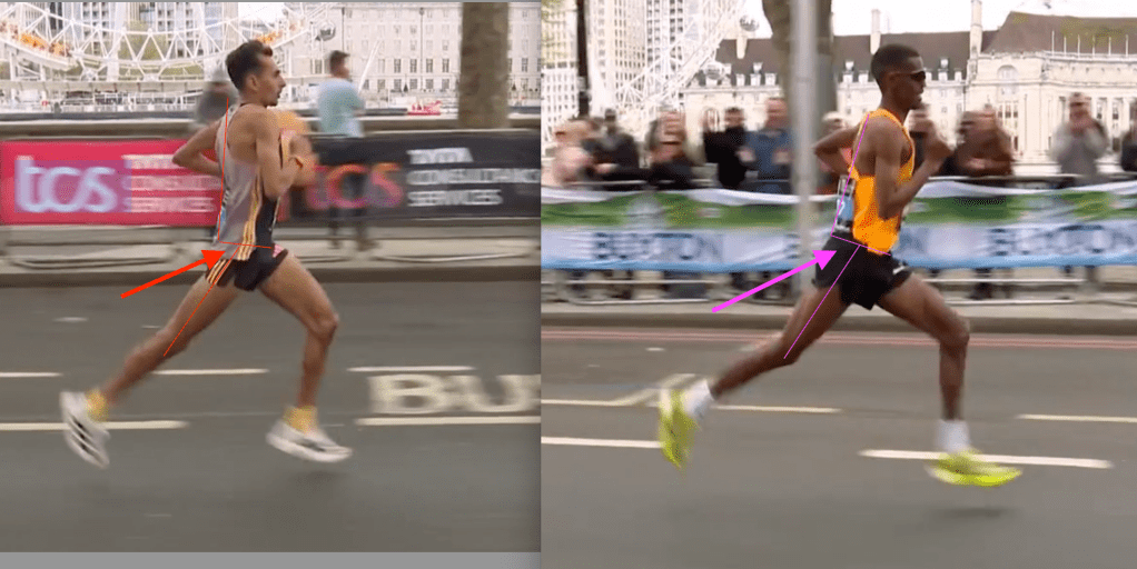 Looking at them both here, just at foot strike on their left foot, both have set up their feet well. Ankles on the strike foot at almost at 90 degrees allowing a decent foot contact, which can absorb the ground reaction force / load and then release. Between the 2 the main difference was the more pronounced lean of Mahamed (suggesting a possible slightly more anterior tilt of the pelvis). This difference seen in the image at the very top of the page as well.