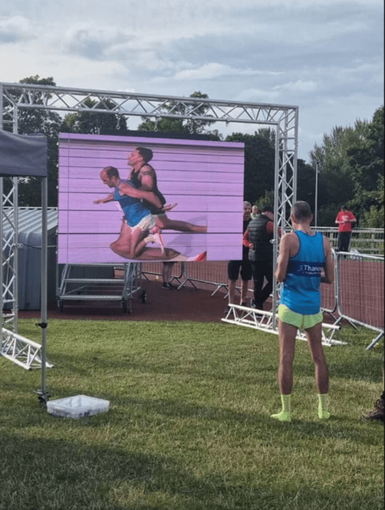 Second lap in 2m 43m, which felt good coming into the lactate lap. Got to 1k and went back past the girl who had passed me and knew I could push on for the last lap. Waited for the bell and then begun to pick up the pace until I caught the guy in the lead with about 240m to go. Rather than go past I decided to sit on his shoulder, have a brief breather and save myself for the race in the straight. As we rounded the final bend I pulled out into lane 2 and pushed, as did the guy in front and he pulled open a gap of around 2m. I kept pushing, as did he and I thought by 60m to go I just didn’t quite have enough. However from somewhere inside of me, with about 30m to go I found that little extra, enough to let me push on and over those last 30m I caught him with a dip for the line. Photo finish and I really wasn’t sure who had won. The announcer had a brief chat with me – he thought I’d just nicked it and the image above then proved it: