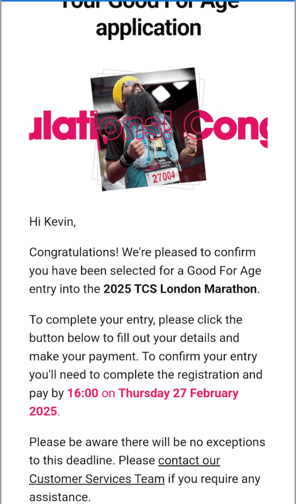 London Marathon GFA accepted – Apr 27th next year, I’ve been loosely training base for this, now it feels sharper as my entry is confirmed.