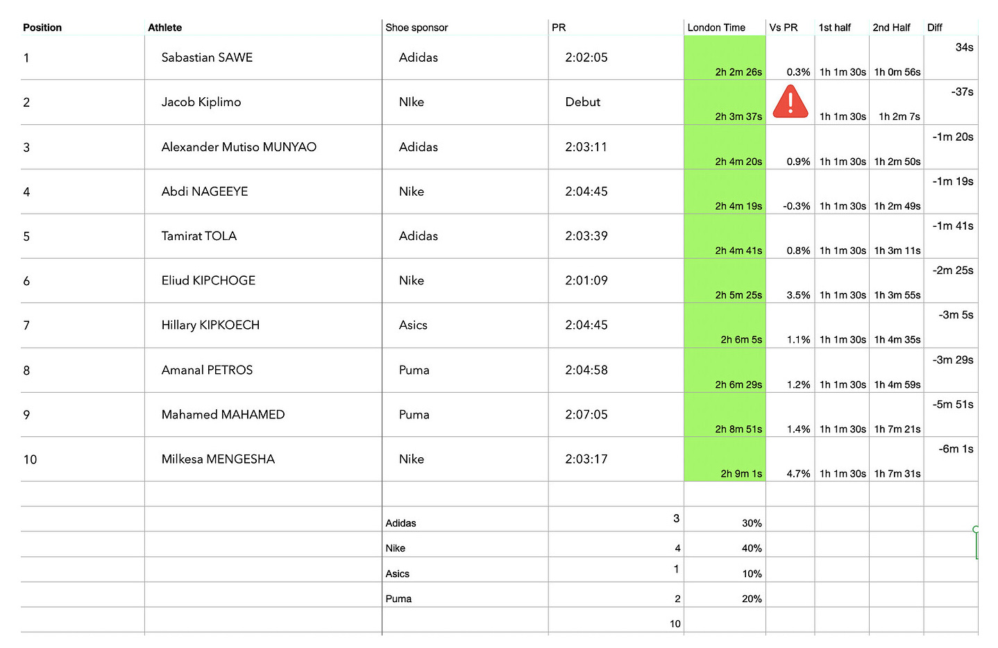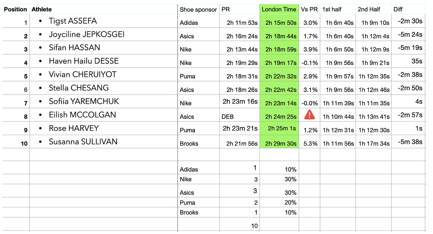 Equally noticeable is a lack of any New Balance athletes top 10, as lead brand sponsor for London this strikes me as a challenge for them.